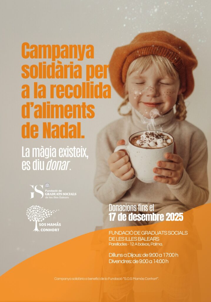 Le informamos que la Fundación de Graduados Sociales de las Islas Baleares, junto con SOS MAMÀS CONHORT, realiza una campaña solidaria para la recogida de alimentos de Navidad: turrones, barquillos, polvorones, galletas, chocolate… y otros productos navideños que puedan gustar a los niños, a la cual le invitamos a participar.